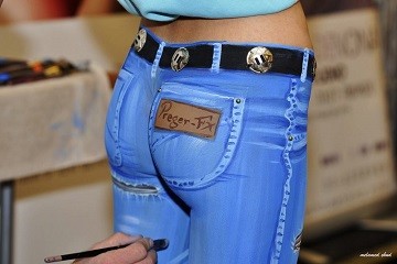את הג'ינס שבתמונה לא ניתן למצוא בקסטרו או בדיזל. זה לא ג'ינס אמיתי, מדובר בציור גוף המתקשר סדנה של דובי פריגר, אמן איפור אמנותי ידוע בארץ ובעולם.
